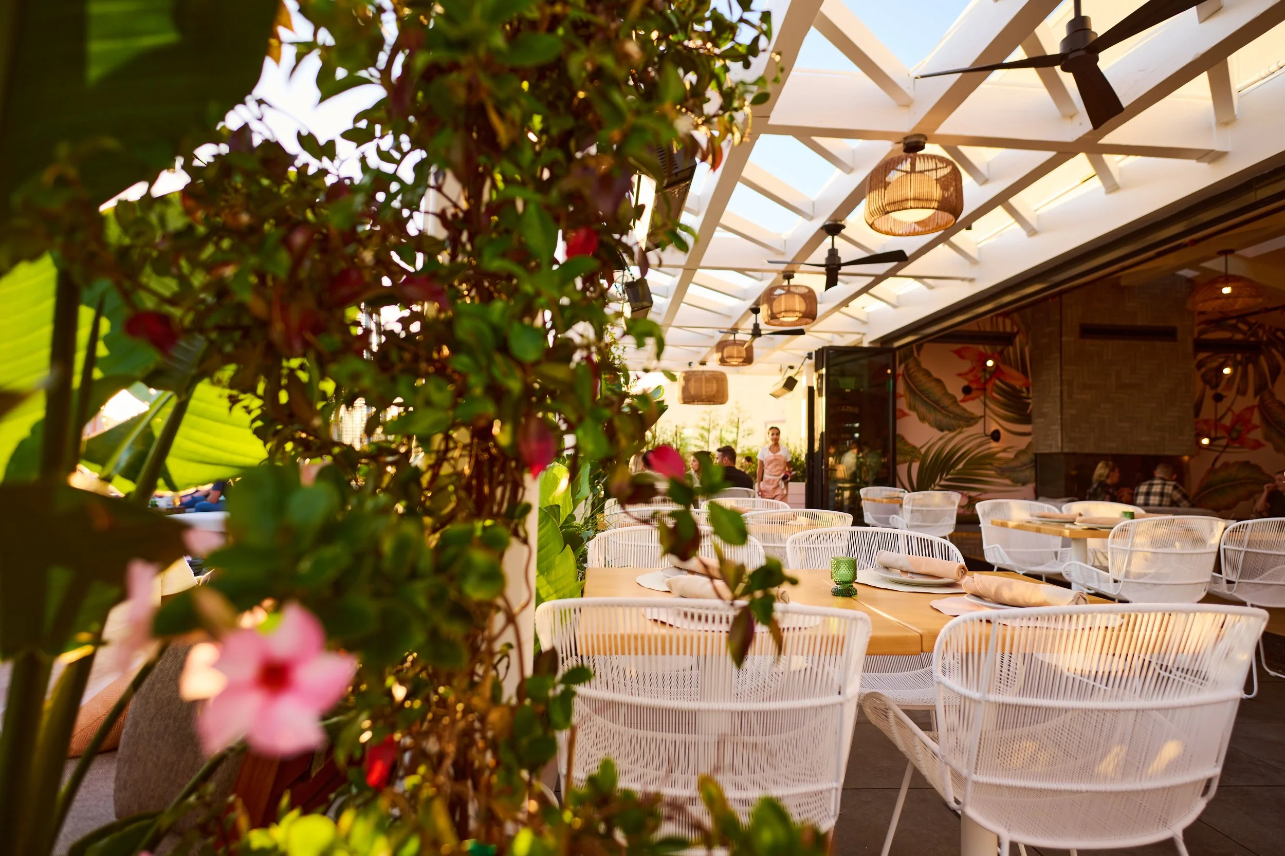 With only 6 weeks to bring an entirely new concept into the space, the rooftop was transformed into a bright, relaxing, oasis through the use of soft, neutral tones, mixed with vibrant pops of color, natural finishes, tons of tropical plant life, and found vintage touches that transport you to that special escape, year-round.